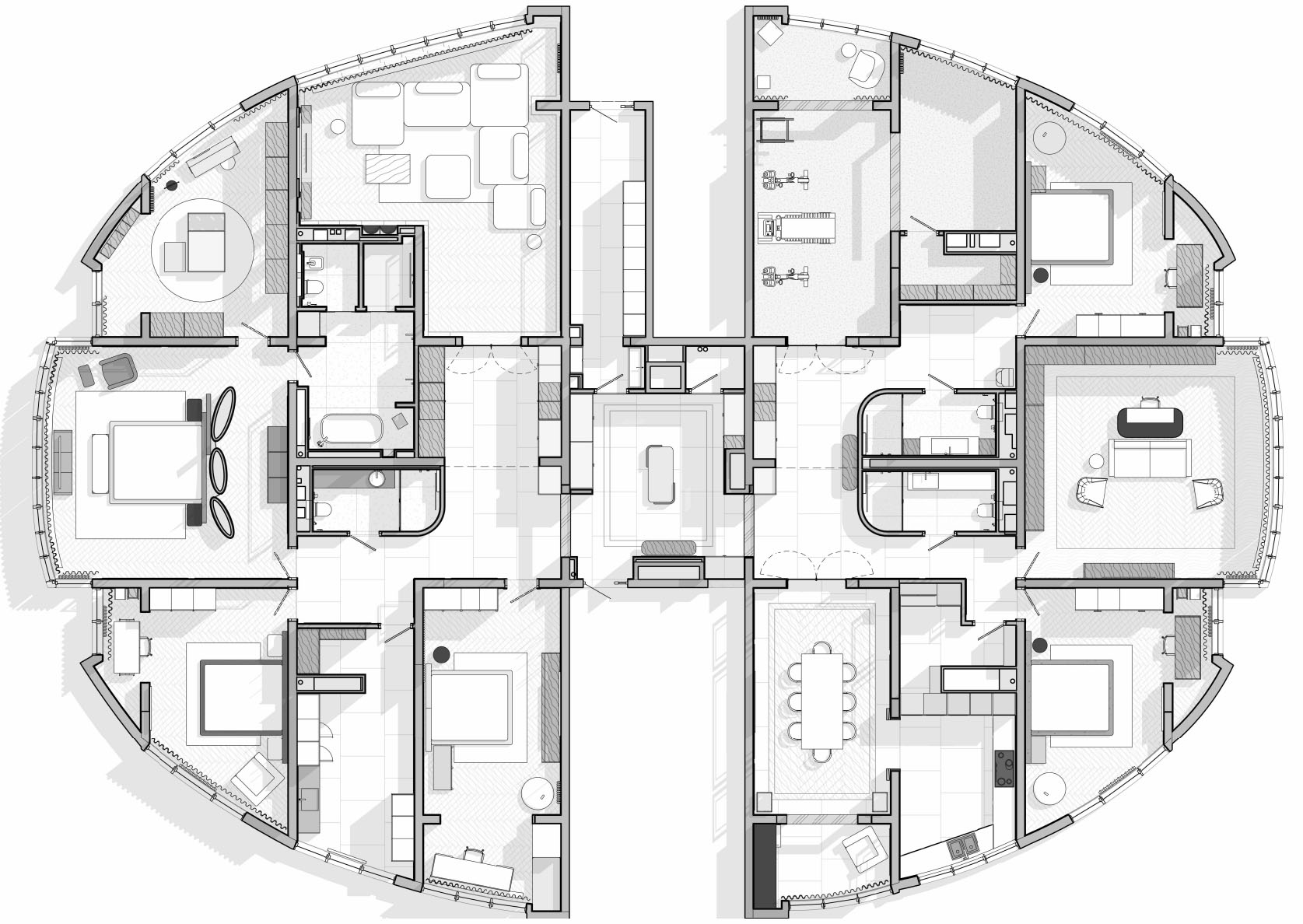 Перед нами стояла амбициозная задача: объединить несколько квартир в единое гармоничное пространство без ощущения разрозненности. Решение было найдено в грамотной планировке: симметричный холл стал сердцем интерьера, связывая все помещения в единую композицию.